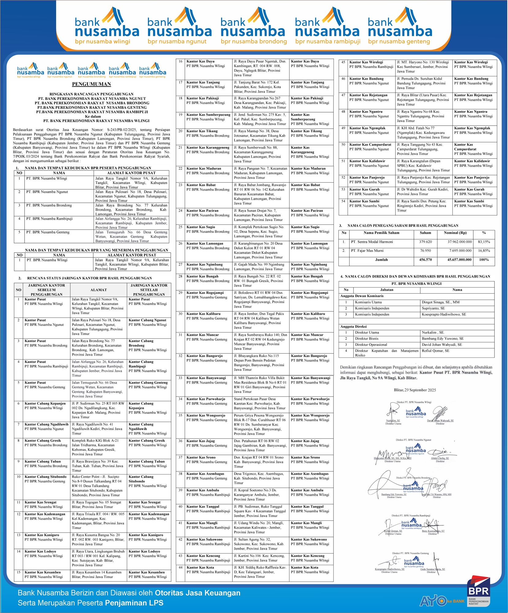 PENGUMUMAN RINGKASAN RANCANGAN PENGGABUNGAN BPR NUSAMBA WILAYAH JAWA TIMUR